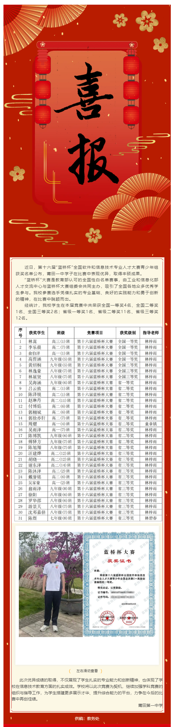 莆田一中学子在全国软件和信息技术专业人才大赛中斩获佳绩