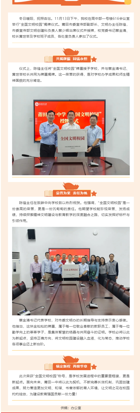 冬日暖阳映金匾 文明薪火传校园——莆田一中隆重举行“全国文明校园”揭牌仪式