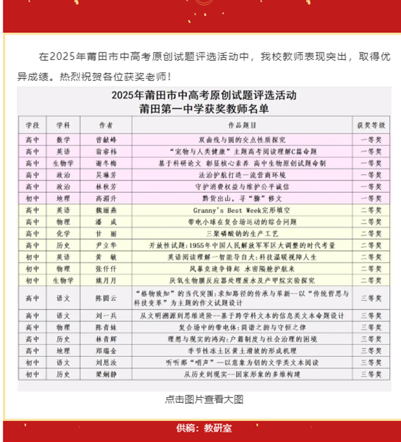 热烈祝贺我校教师在2025年莆田市中高考原创试题评选活动中取得优异成绩