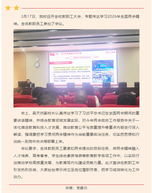 学习教育 | 我校召开教职工大会专题学习2026年全国两会精神