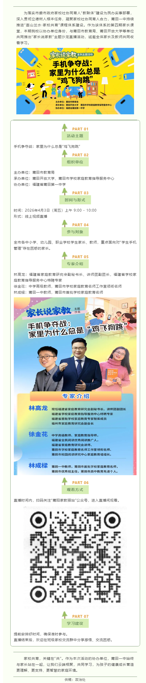 共赴云端之约 破解“手机争夺战”——“壶山兰水·家校共育”第四期家长课堂邀您收看“家长说家教”主题沙龙直播活动