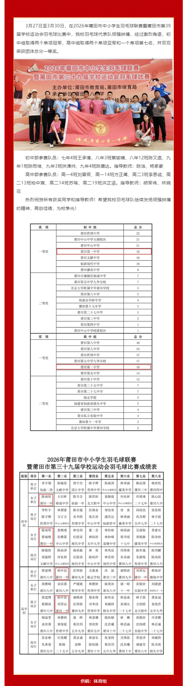 热烈祝贺我校羽毛球队在2026年莆田市中小学生羽毛球联赛中取得优异成绩