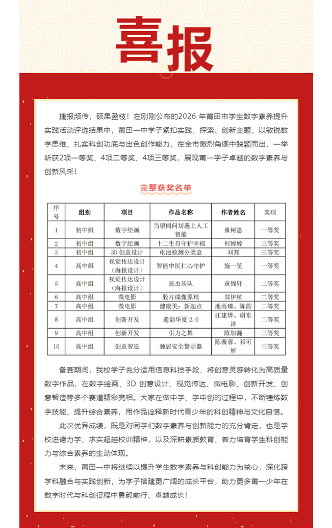 喜报|数字赋能,科创逐梦!莆田一中学子在 2026 年莆田市学生数字素养提升实践活动中斩获佳绩