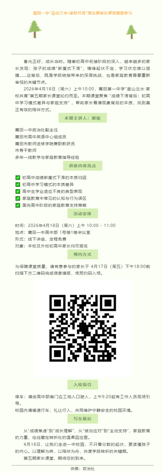 初高中学习模式差异与家庭支持——莆田一中“壶山兰水·家校共育”第五期家长课堂邀您参与