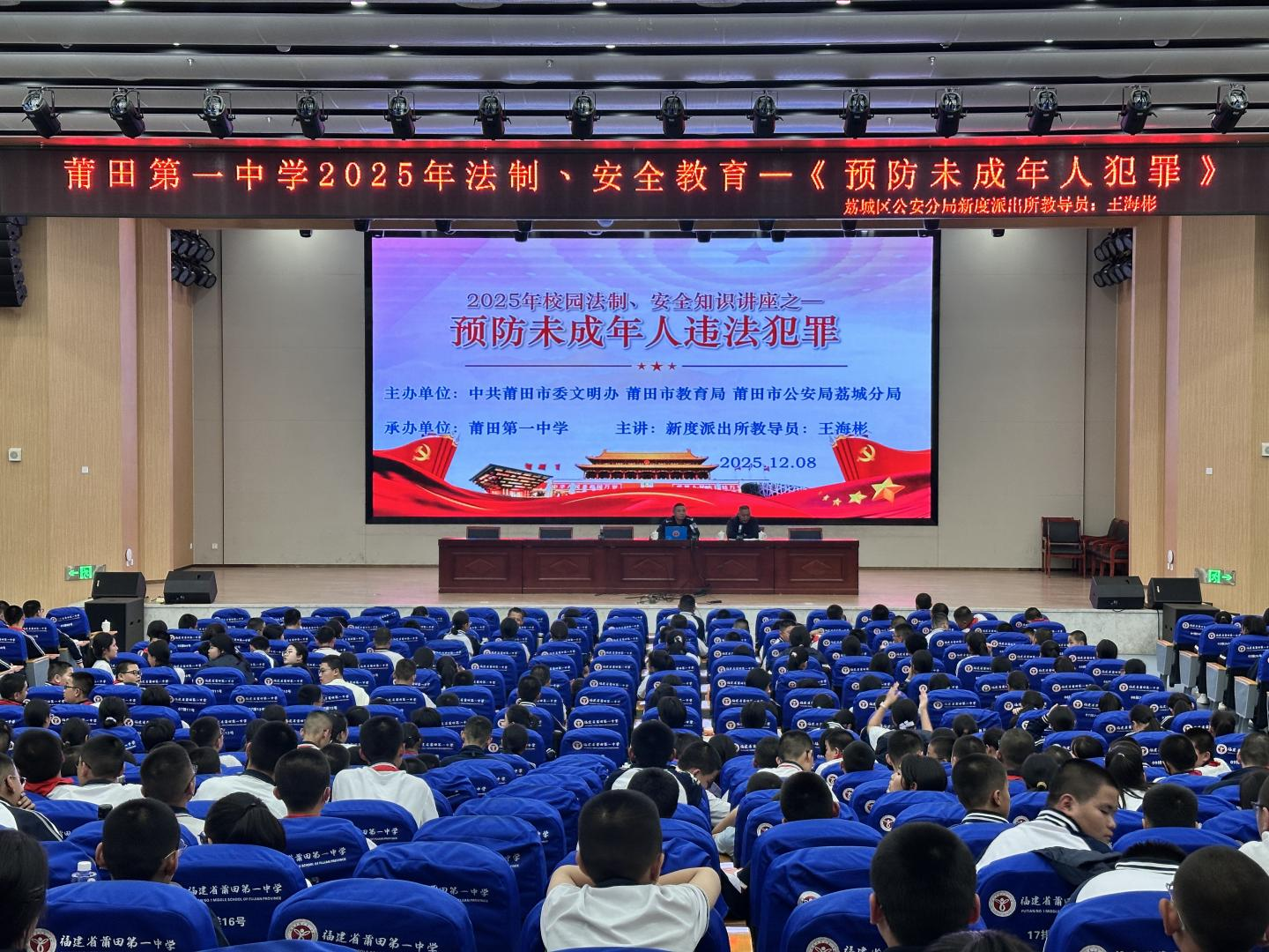 -莆田第一中学开展《预防未成年人犯罪》专题讲座- 为进一步加强校园法制教育,丰富学生的法律知识,增强同学们的法治观念和安全意识,让每一位同学都能知法、懂法、守法,学会用法律武器保护自己,提高学生自我保护意识和能力,同时有效预防未成年人违法犯罪,并推动形成家校社协同共育的良好局面。2025年12月8日下午,我校邀请来荔城公安分局新度派出所教导员王海彬警官到我校开展“法治进校园之如何预防未成年人违法犯罪”主题讲座。为七年级700多名同学带来了一堂生动且深刻的法制教育课。