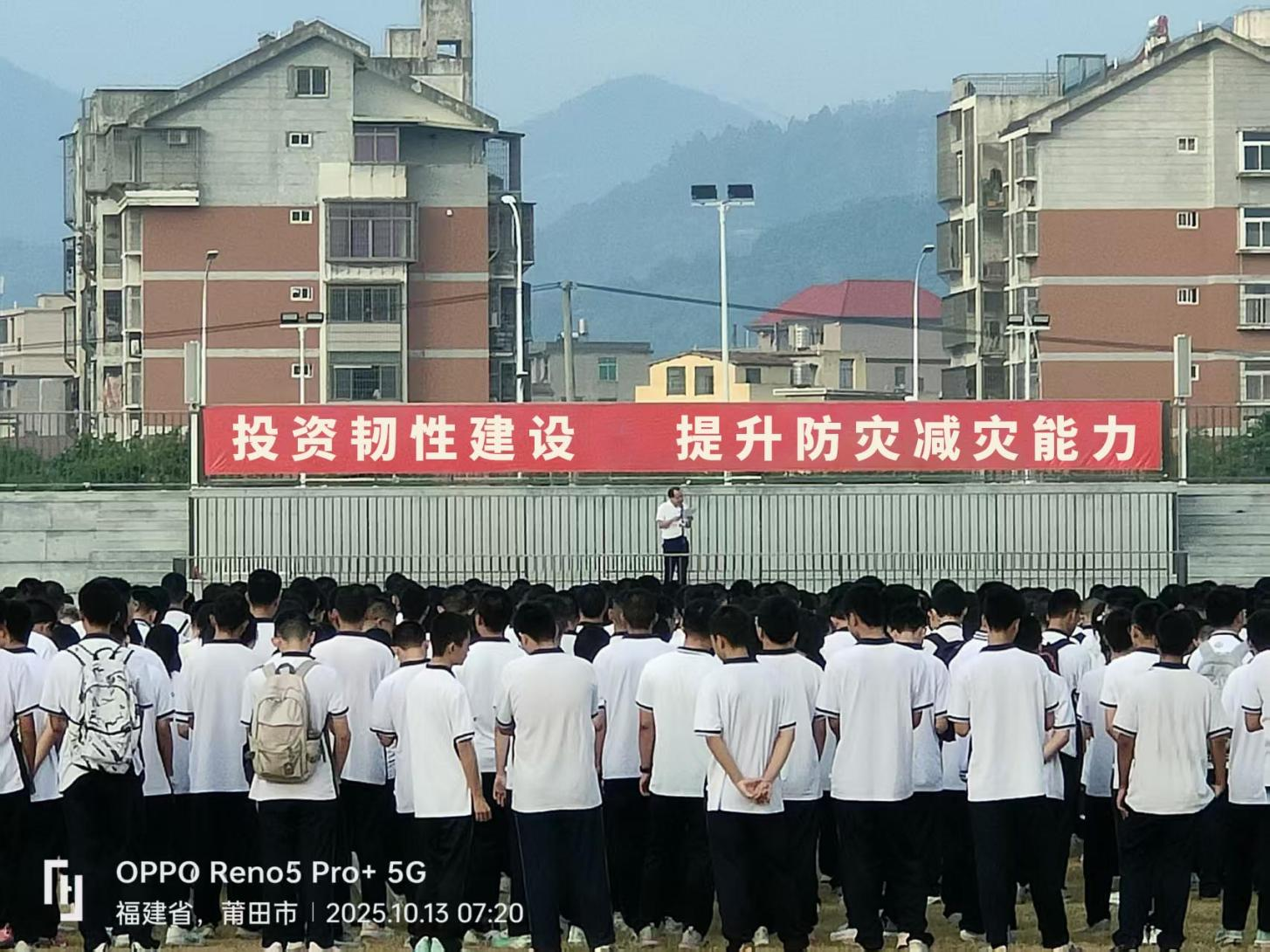 —莆田第一中学开展“国际减灾日”系列活动— 2025年10月13日是第36个国际减灾日,主题为“投资韧性建设,提升防灾减灾能力”。为深入贯彻落实习近平总书记关于防灾减灾救灾重要指示精神,聚焦“两个坚持、三个转变”总要求,切实增强全校师生的防灾减灾意识,提高应对突发事件的能力,莆田一中围绕“国际减灾日”主题开展系列系列活动,让师生学习各类防灾减灾知识,提高师生防灾减灾意识和应急避险能力。为校园安全保驾护航。 一、普及防灾知识,凝聚防灾“一条心” 10月13日,我校利用升旗仪式开展了国际减灾日主题教育活动。在庄严的国旗下、学校党委委员教务处主任李真老师进行了以“投资韧性建设,提升防灾减灾能力”为主题的讲话,向全体师生普及了国际减灾日的由来、意义以及常见灾害的应对方法,呼吁大家重视防灾减灾,从自身做起,为构建安全和谐校园贡献力量。同时学校利用校园内LED屏幕滚动播放防灾减灾宣传标语,让师生们对国际减灾日有了更深刻的认识。