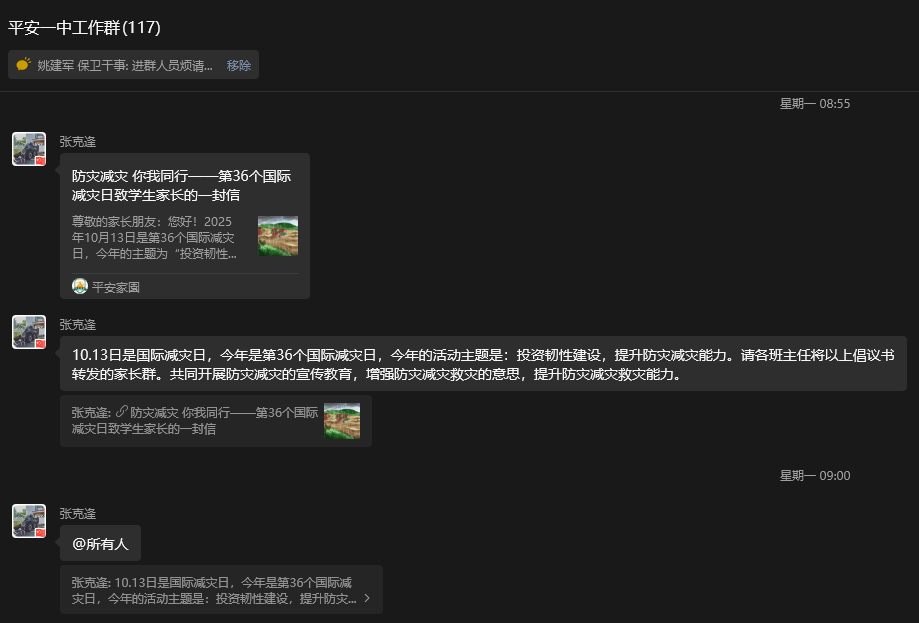 利用家校微信群向家长、教职员工宣传防灾减灾安全知识,推动全民防灾减灾安全意识和防范能力。
