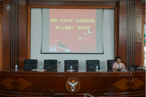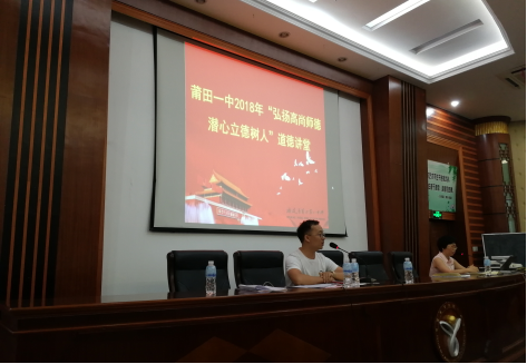 弘扬高尚师德 潜心立德树人 —莆田一中开展2018年庆祝教师节道德讲堂活动 三尺讲台育桃李,一支粉笔写春秋。在第34个教师节来临之际,为进一步加强我校师德师风建设,提升教师的职业道德修养,9月10日下午,莆田一中2018年庆祝教师节暨“弘扬高尚师德 潜心立德树人”道德讲堂活动在莆中楼三楼会议室举行,全校教职工共200多人参加了本次活动。 本次道德讲堂共分“听歌曲、看短片、谈感想、作点评、送赠言”五个环节。首先,全体教师共同欣赏了由厦门六中合唱团的教师节献礼歌曲《夜空中最亮的星》,学生们干净纯真的歌声令人深深陶醉;接着,全体老师又共同观看了由桐庐县城南小学师生拍摄的短片《老师不是神仙》,让我们深深体会到老师虽然不是神仙,但这份职业却是无比神圣的。鲁迅先生说:教育植根于爱。所以说,为了孩子们的健康成长,我们没有任何理由懈怠!在谈感想环节中,2018届文科实验班班主任尹立华老师交流了他牺牲节假日休息时间,默默耕耘在教学一线的感人事迹,他的那句朴实无华的“既然当老师,就当一名好老师吧”引起了在场老师的强烈共鸣。随后,校党委郑高翔书记对本次道德讲堂活动作精彩点评,他勉励大家要以真挚的感情对待学生,以高尚的情操感染学生,用爱用心书写出师德的动人篇章。最后,主持人送一句赠言:“诚挚的心灵,是学生情感的钥匙;高尚的师德,是学生心灵的明镜”,道德讲堂活动在温馨和谐的氛围中落下帷幕。