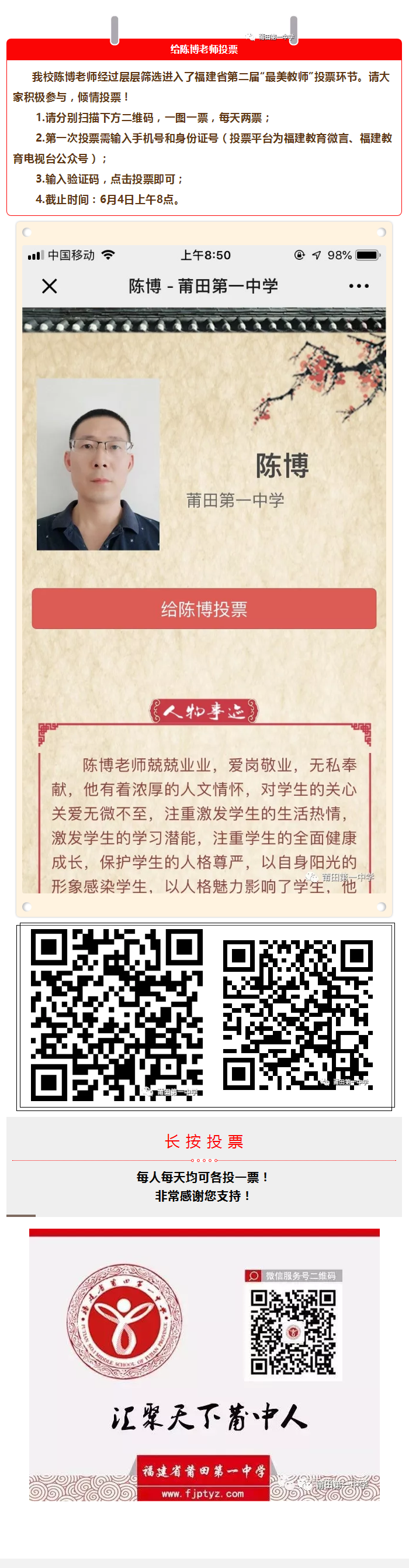 【为莆田一中打Call】莆田一中陈博老师入围福建省第二届“最美教师”,请您为他投票,为一中打Call