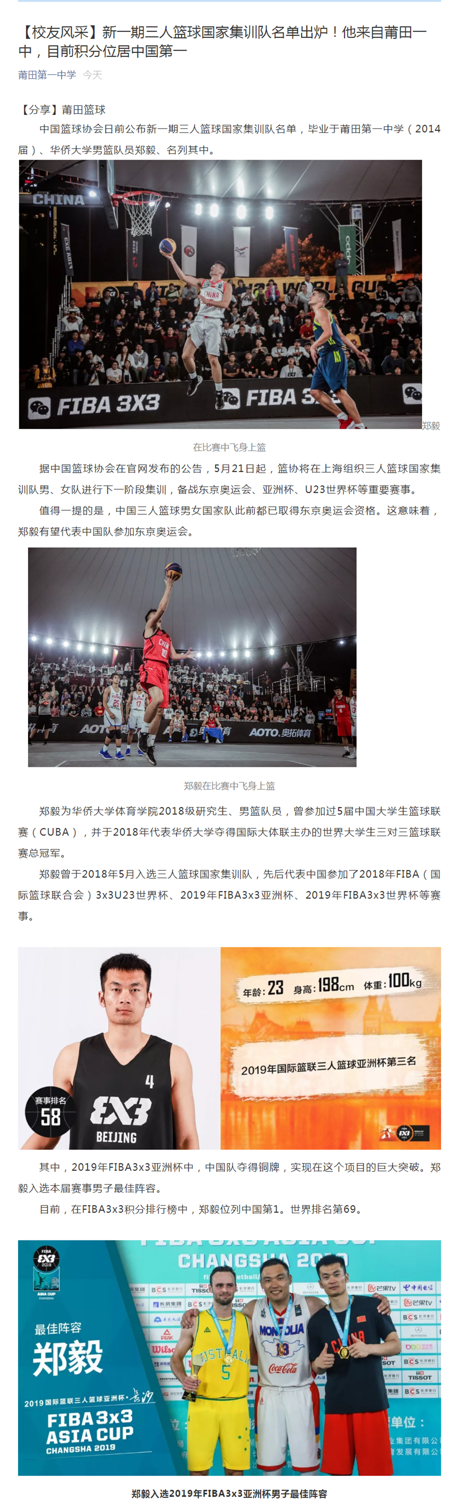 【校友风采】新一期三人篮球国家集训队名单出炉!他来自莆田一中,目前积分位居中国第一