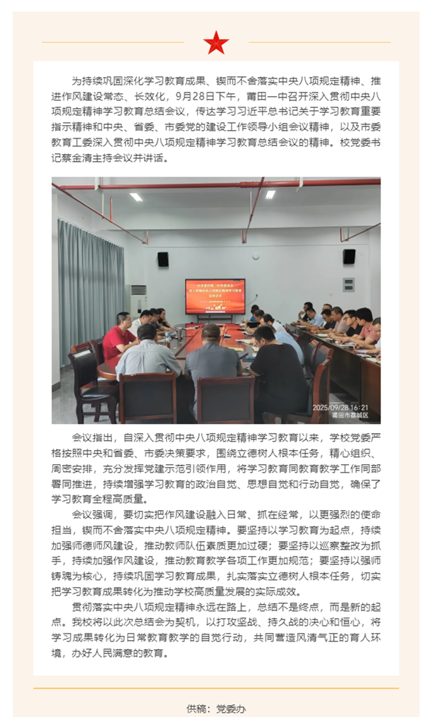 莆田一中召开深入贯彻中央八项规定精神学习教育总结会议