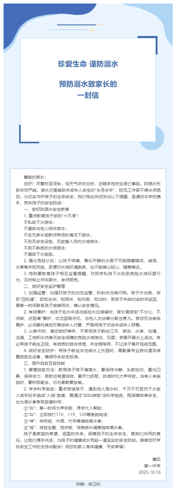 珍爱生命 谨防溺水——预防溺水致家长的一封信