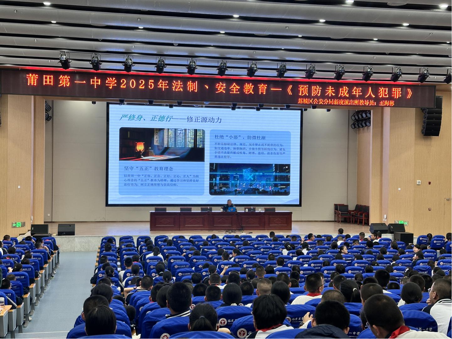 -莆田第一中学开展《预防未成年人犯罪》专题讲座- 为进一步加强校园法制教育,丰富学生的法律知识,增强同学们的法治观念和安全意识,让每一位同学都能知法、懂法、守法,学会用法律武器保护自己,提高学生自我保护意识和能力,同时有效预防未成年人违法犯罪,并推动形成家校社协同共育的良好局面。2025年12月8日下午,我校邀请来荔城公安分局新度派出所教导员王海彬警官到我校开展“法治进校园之如何预防未成年人违法犯罪”主题讲座。为七年级700多名同学带来了一堂生动且深刻的法制教育课。